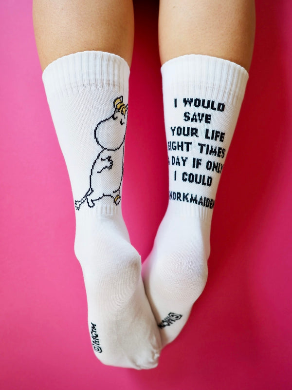 Sidosteen Muumi-sarjan Niiskuneiti-sukat hurmaavat lempeydellään: tennissukkamalliset, luomupuuvillasta valmistetut sukat ovat pehmeät niin materiaalilta kuin sanomaltaankin.